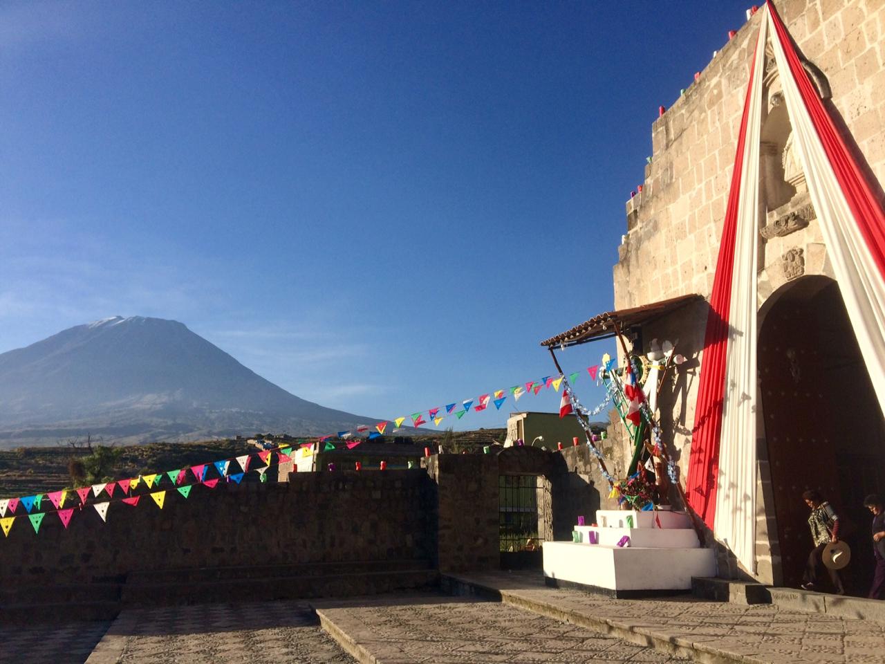We began looking for a hospedaje to stay in that night but alas there wasn’t one. So people told us to seek out El Padre (the priest) and ask him if we could stay with him. We sat outside the church and waited, as the sun went down and the temperature dropped. Eventually he appeared in his black robes and we rushed over to him to explain our situation. He was understanding but asked that we spoke to him after mass! In the meantime the bundles of branches had become a series of mini bonfires and we joined a lovely family from Arequipa who were passing around a bottle of warm purple aniseed liquor.
