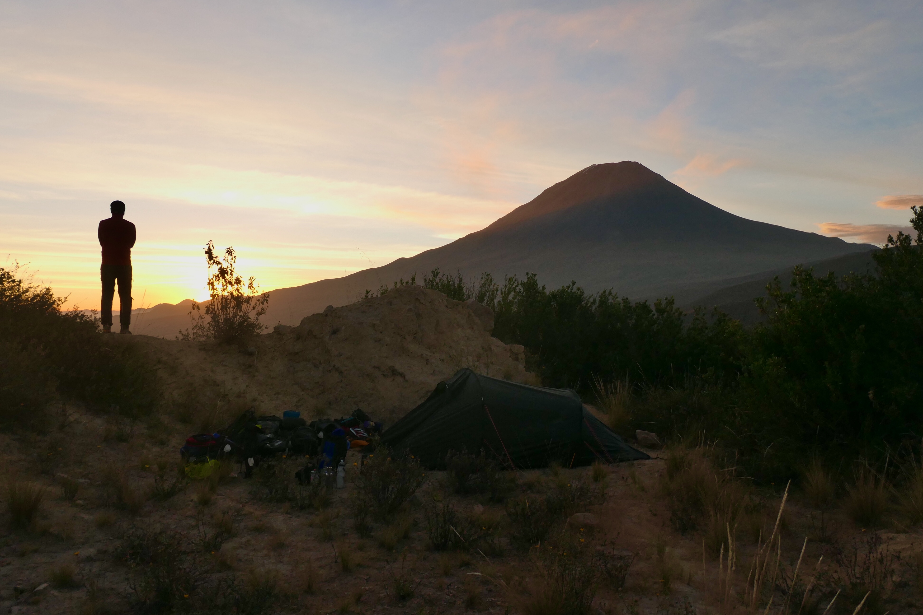 The following day we continued snaking our way up the mountain road. The drivers of double-trailer lorries waved and hooted at us enthusiastically before enveloping us in a cloud of dust. We decided we would only climb as far as 3,500m and, as luck would have it, there was a wonderful wild camping spot just off the road in a rocky hollow. Volcan Misti dominates the skyline as soon as you arrive in Arequipa and here she felt closer than ever, especially the canyons and ravines which define her slopes.