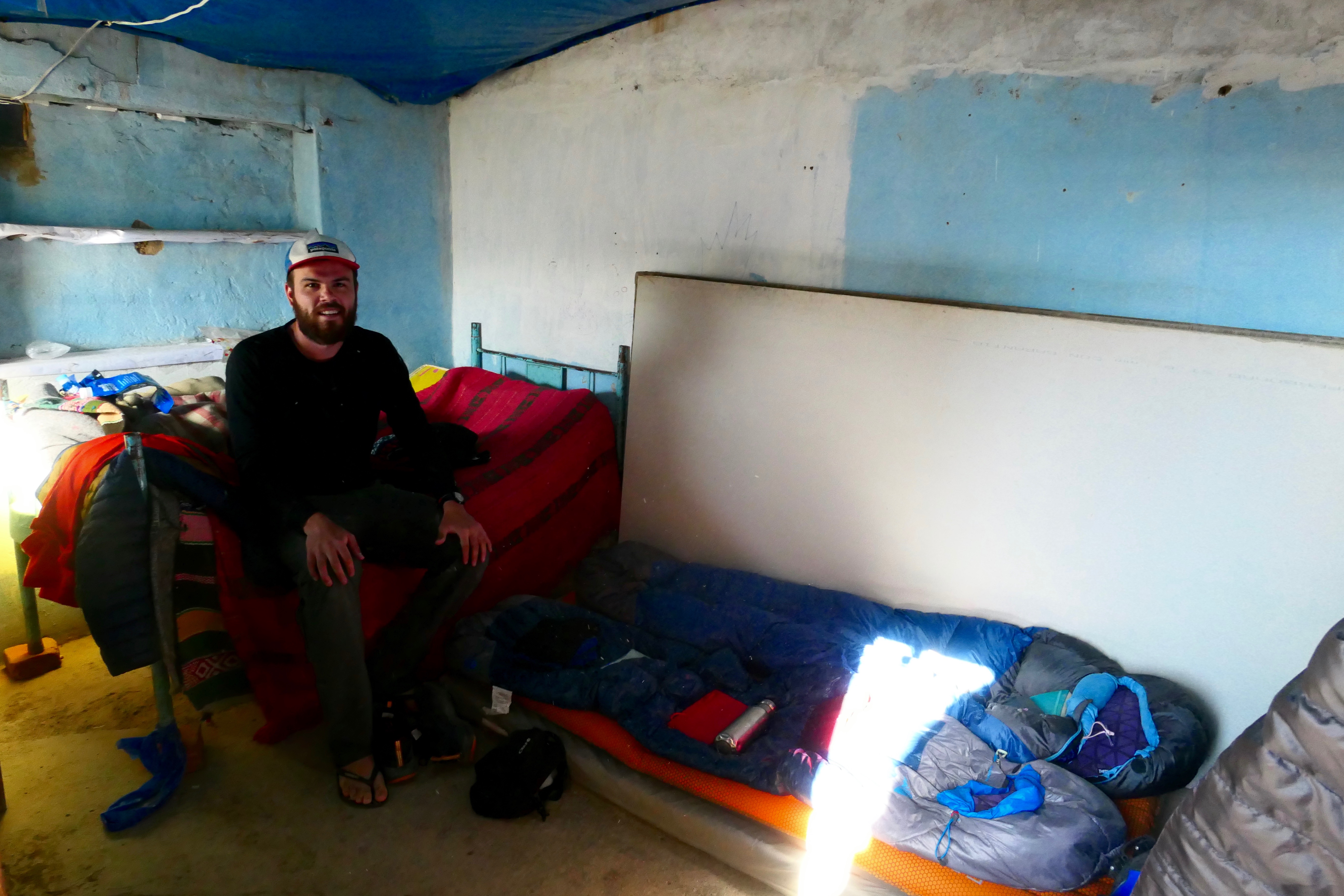 In search for somewhere to stay, Jose told us to speak to the lady who owned the mint green painted corner shop. She led us out the back of her shop into a courtyard with nine squat, terraced rooms. Our room was small but adequate given the lack of other options: a corrugated metal door which you locked using a padlock (luckily I brought mine); a sagging blue tarpaulin ceiling; a table and chair; a light bulb with five wires attached to it; a metal framed bed with a thin mattress and several tired-looking blankets. The concrete walls were painted a mixture of light blue and white, and there was even some graffiti written in black pen: HENRY. Outside, a cockerel and two hens roamed the dusty courtyard – no need to set our alarm clock then. There were also two flush less toilets – ‘varones’ & ‘damas’ – which stunk. Unfortunately for me, the cubicles hadn’t been built for anybody over 5ft 5, and so as I took a pee in the freezing cold I had to crouch over and look straight into the murky water. In hindsight, I should never have agreed to the 20 soles (£5) per night the owner was charging us, but being so thankful for a place to rest our heads after an eventful few days, I didn’t have the energy to negotiate. We were warm(ish) and dry. It would do.