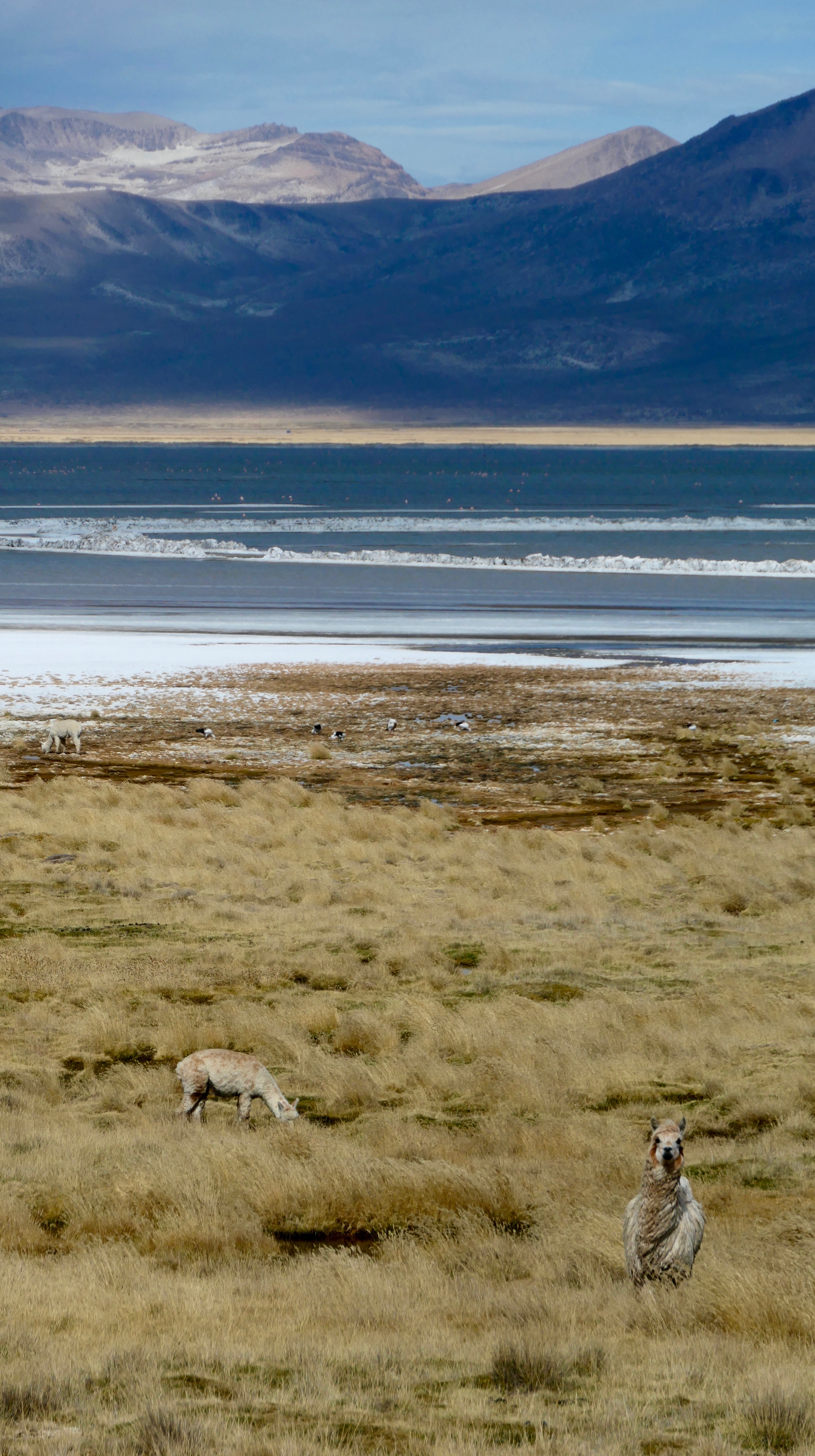 Salinas Moche’s setting on the southern shore of the glistening Laguna Salinas is bleak but spectacular, encircled by a ring of mountains and volcanoes. During the day alpaca and llama graze freely in the pasture leading down to the lake. The village itself is simple, but friendly. Tourists often come in vans on day trips to take photos of the lake and then leave, so the locals were surprised to see us hanging around.