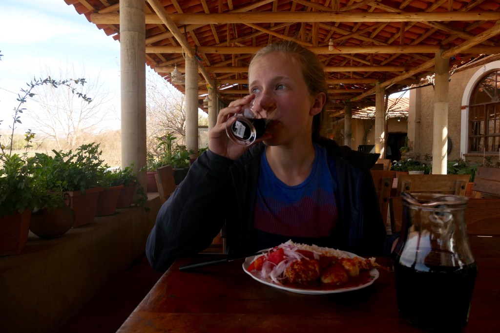 Our main reason for visiting Tarija was to explore the wine region. Yes – there is wine in Bolivia! We headed out on our bikes to Valle de la Concepción, with just our rucksacks strapped on the back. It felt great to bike so light, but also very strange to know we weren’t self sufficient – I actually didn’t like that we had to make it to the hostel that night, even though it wasn’t very far away, or that we had to find a restaurant for lunch on our way back to Tarija the next day. I’m used to always having our house (tent), bed (sleeping bag) and kitchen (gas stove and noodles) on hand, so I felt quite vulnerable. But it was only a couple of hours’ cycling and before we knew it we’d arrived in Bolivian wine land and were sipping vino patero – foot crushed wine. An interesting taste…