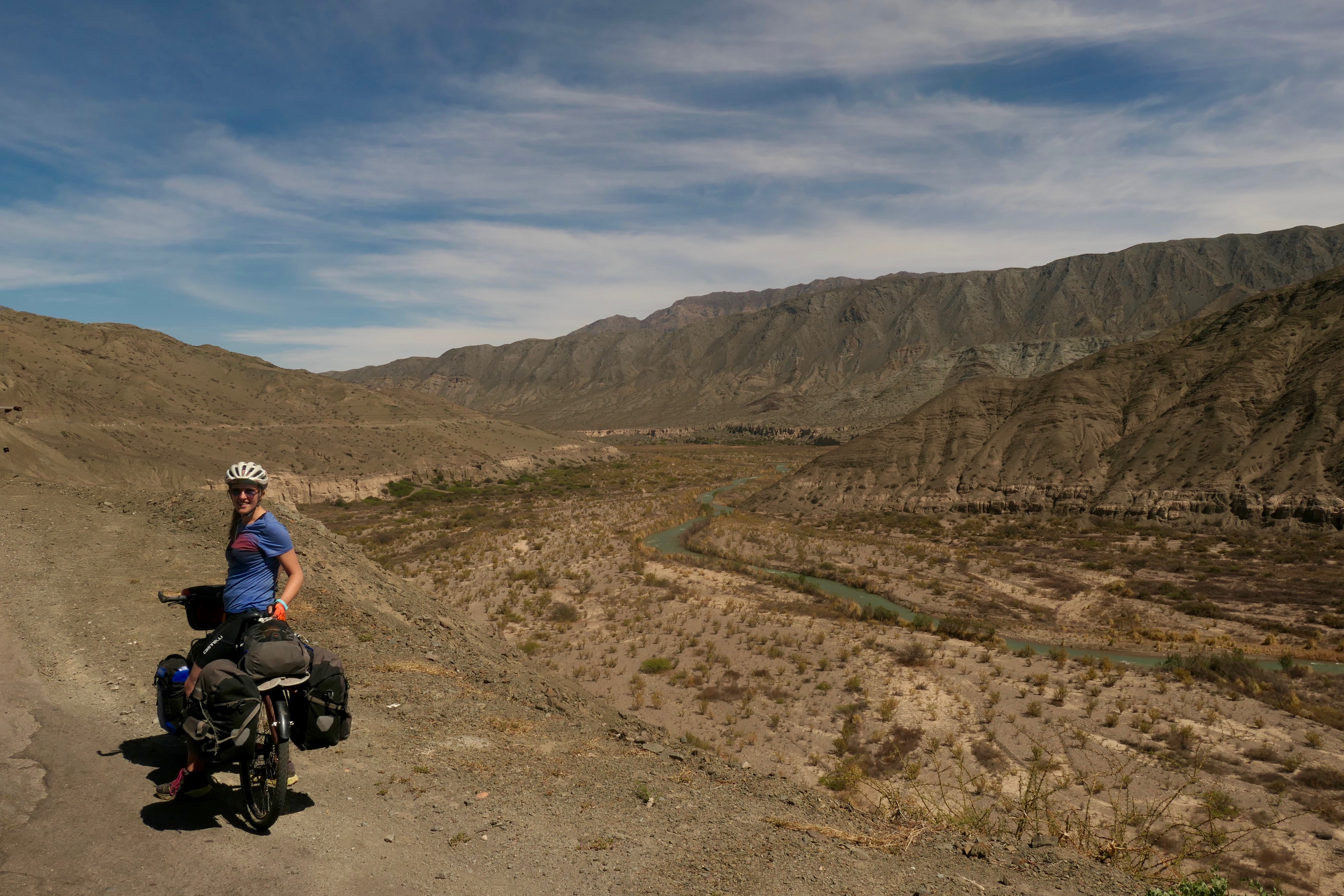 An energetic Argentinian pulls over on his scooter, asking “selfie?” I would normally roll my eyes, especially in my current mood, but something tells me I like this guy. It turns out Jairo is an endurance runner, so sort of understands what we’re going through. He’s super excited for us to get up on the Puna (the Argentinian word for the altiplano), tells us to keep drinking water, look after ourselves and have fun! His energy and kindness is infectious. And then as if the landscape is reflecting our mood the beige road and beige mountains I was complaining about give way to a dramatic, deep reddish-purple valley with an emerald green river cutting through it. The road ahead of us winds upwards towards snowcapped mountains just peeking out in the distance. The mood-o-meter has done a full swing from red to green. I’m back.