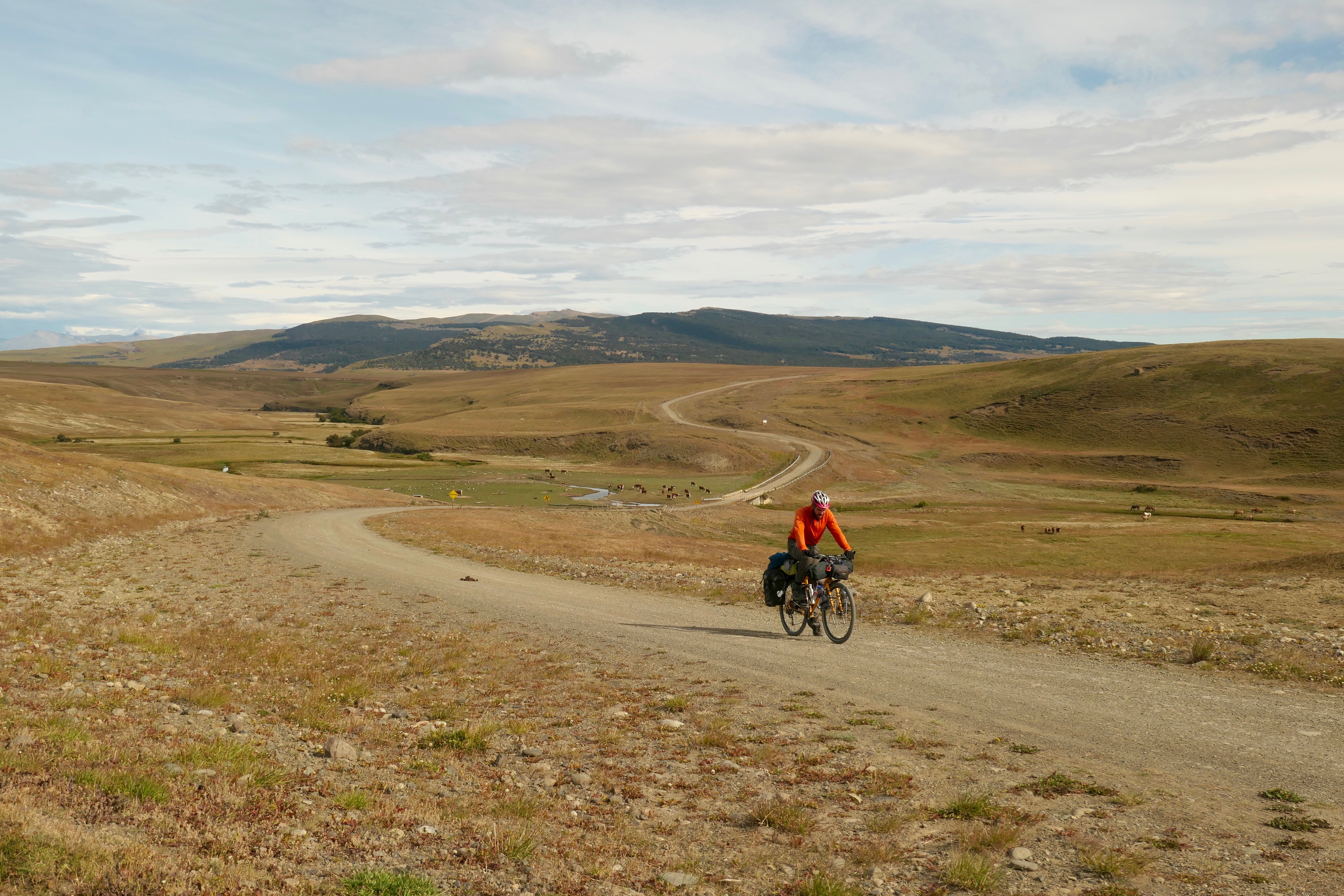 As we left the station early the next morning we could see sunrise on the towers of Torres del Paine 100km away. There wasn’t a breath of wind as we cycled towards them. We followed a gravel road where we didn’t see a single vehicle or person until the border back into Chile. After two weeks of noise, either from busy towns or roaring winds, most shocking of all was that even these harsh and barren landscapes can bring moments of total stillness and quiet.
